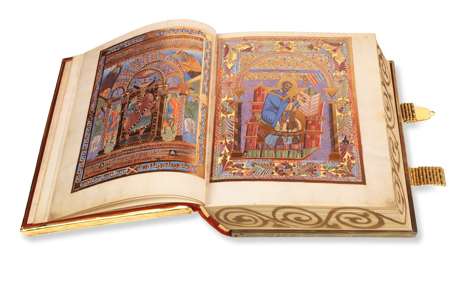 Das bemerkenswerte Krönungsbild macht die königliche Stiftung auf den ersten Blick deutlich: Heinrich wird von den heiligen Bischöfen Ulrich und Emmeram gekrönt und mit den Reichskleinodien, der heiligen Lanze und dem Reichsschwert, ausgestattet. Das Thronbild zeigt den König in seiner vollen Pracht und Macht. Und das Autorenbild von Gregor dem Großen, dem legendären Verfasser des Sakramentars, stellt einen weiteren großen Namen in diese Reihe.