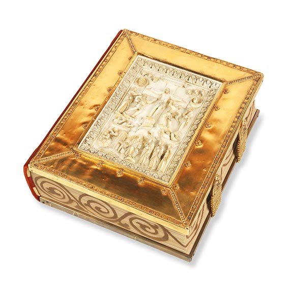 Geschützt werden die Seiten der Prachthandschrift durch einen Einband, der dem Inhalt des Buches würdig ist. In einer Goldfassung ist auf der Vorderseite ein Elfenbeinrelief eingelassen, das zeitlich wohl kurz vor der Handschrift zu datieren ist. Zum Thema hat es im oberen Register die Kreuzigung Christi und zeigt darunter die Szene der Frauen am Grabe. Die Rückseite des Einbandes wird geschmückt durch eine teilweise vergoldete Silberarbeit, die den schon im Buch dargestellten Papst Gregor den Großen zeigt.